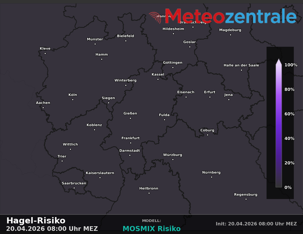 In den Nachtstunden verlagert sich der Niederschlagsschwerpunkt. Von Nordrhein-Westfalen über Hessen bis in die zentralen Teile Deutschlands ziehen schauerartige und zum Teil gewittrig durchsetzte Regenfälle auf. Diese ziehen im weiteren Verlauf von den westlichen Gebieten weiter in Richtung der Landesmitte.